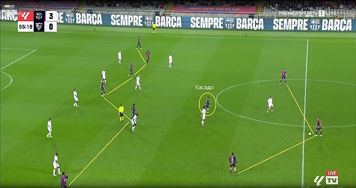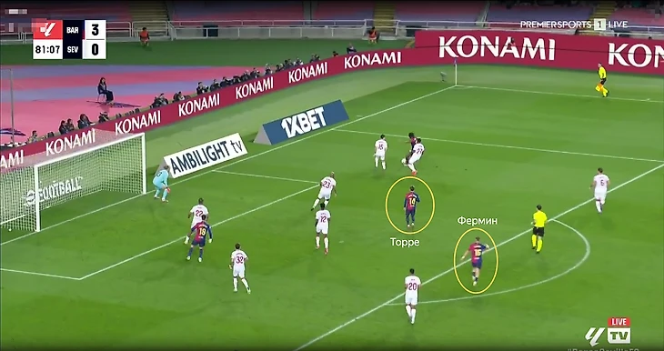 А вот картина перед первым голом Пабло Торре, где сразу два игрока «Барсы» (Фермин и Торре) без опеки готовы открыться на ударной позиции.