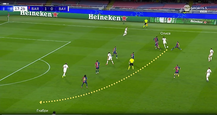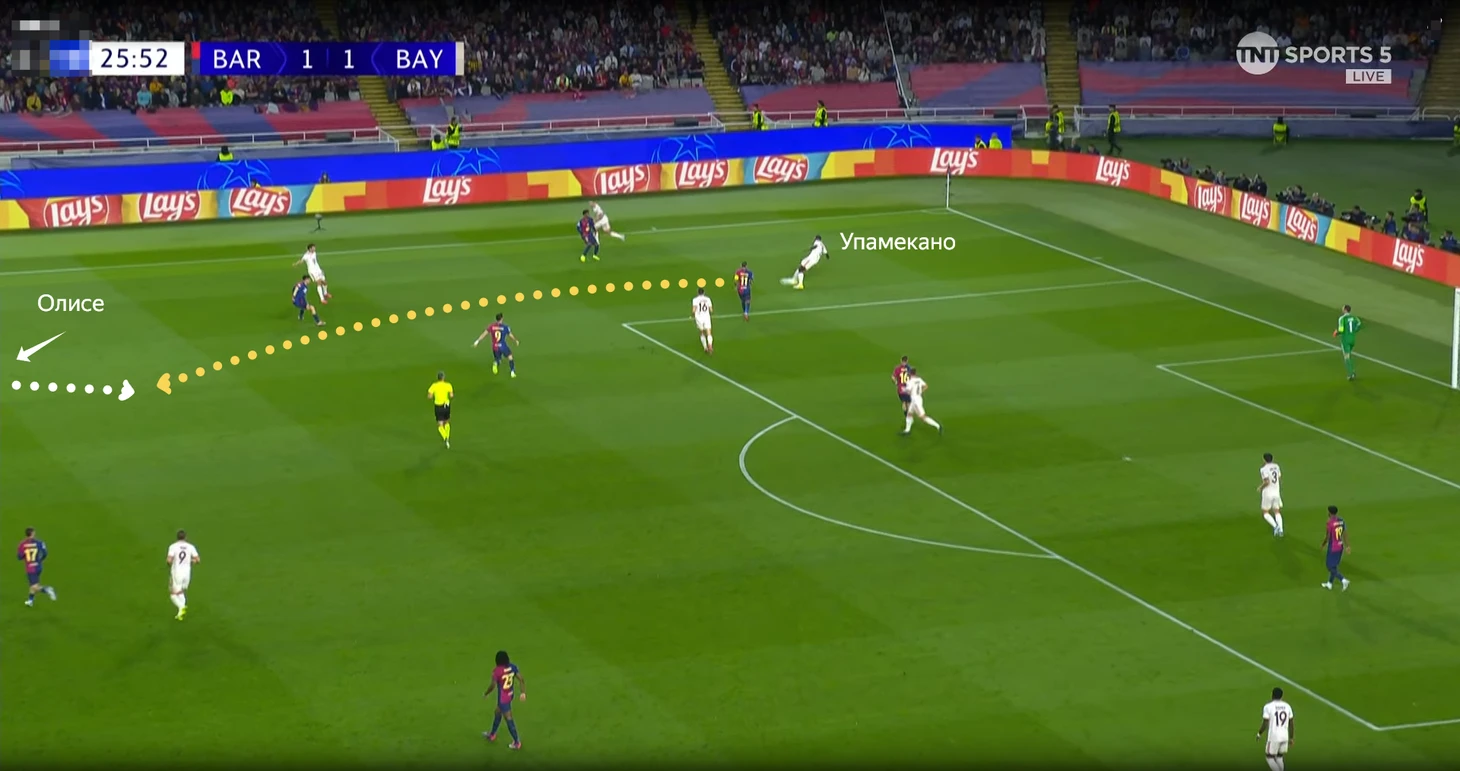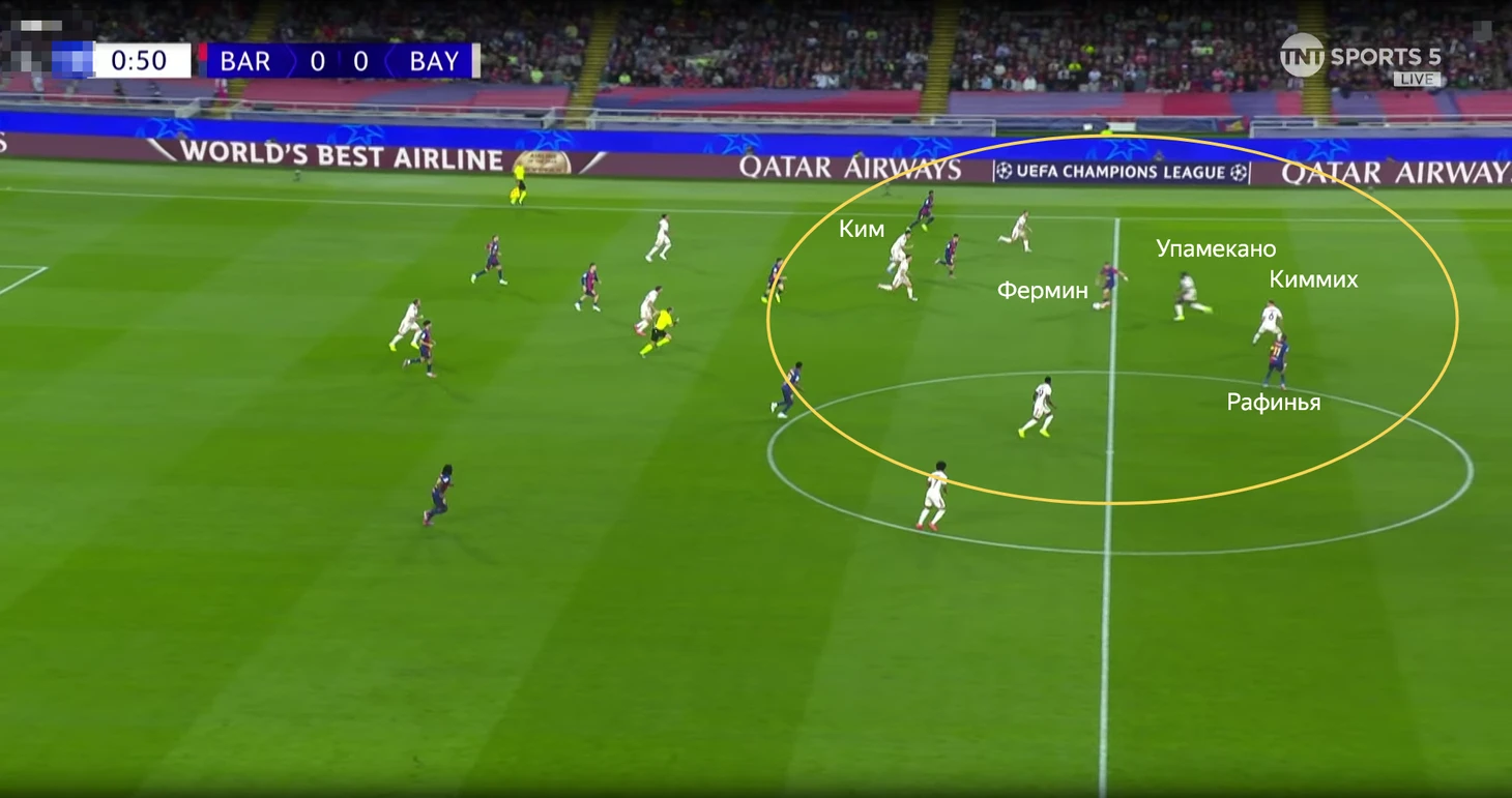 Здесь каталонцы не успевают накрыть Упамекано на мяче. В результате француз передачей отрезает целую группу игроков «Барселоны», а «Бавария» получает возможность выйти в атаку на свободном пространстве.
