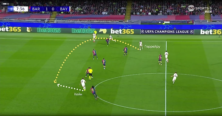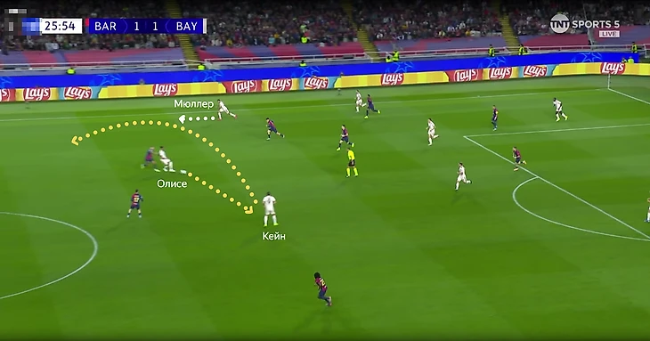 В некоторых ситуациях «Барса» извлекала из подобного стиля много пользы. Но иногда случались провалы, которые приводили к опасности уже у своих ворот. Например, здесь «Баварии» удалось вывести Кейна фактически один на один. Мюнхенцы воспользовались пространством за спинами защитников команды Флика.