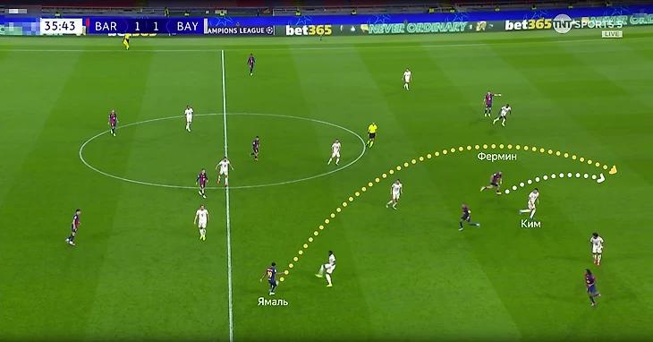 Глобально оба этих забитых мяча не выбивались из общего игрового рисунка. Команды продолжали действовать смело. «Барселона» этим лучше воспользовалась. Здесь из-за проактивной манеры игры Ким Мин Чжэ корейца удалось вытянуть со своей позиции. Дальше последовала передача за спину защитнику «Баварии» на рывок Фермина в свободное пространство.