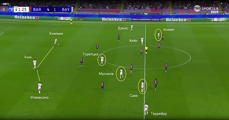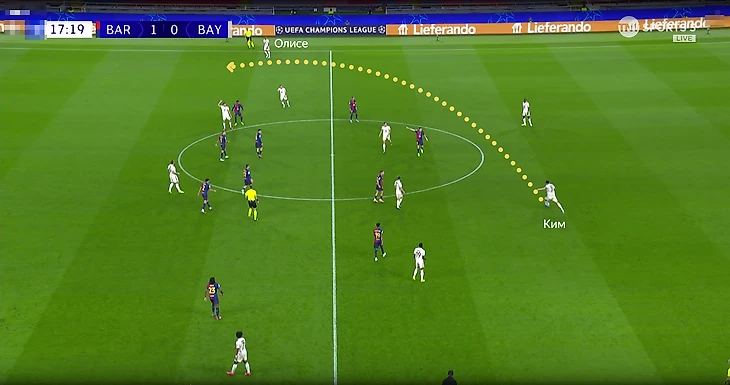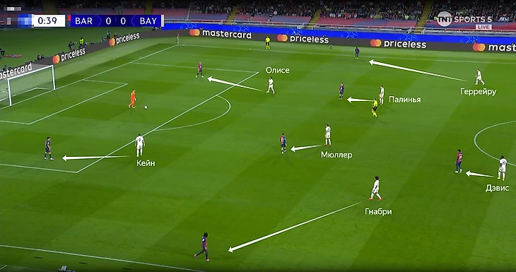 Палинья поднимался к Мюллеру для опеки опорных полузащитников «Барселоны». Слева по крайнему защитнику действовал Гнабри. Справа зону Олисе страховал Геррейру.