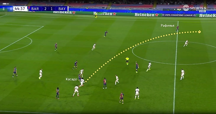 Забитый мяч «Барселоны» в самом начале встречи это отлично продемонстрировал. Гости пошли в интенсивное давление, оставив сзади рискованное соотношение. В результате последним защитником оказался Киммих, который не смог остановить Рафинью.