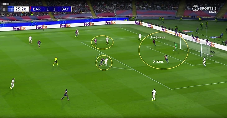 Вот ещё более радикальный пример стремления «Барселоны» оказывать давление до конца: сразу два футболиста (Рафинья и Ямаль) идут в прессинг на вратаря. Эпизод почти закончился привозом Нойера, который оказался в очень непростой ситуации.