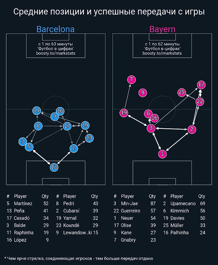Обе команды исторически стремятся играть от себя о доминировать на футбольном поле. При Флике и Компани перекос в эту сторону сохранился и даже усилился в некоторых аспектах. Про «Барселону» будет подробнее в следующем пункте. Сейчас фокусируемся на действиях «Баварии».