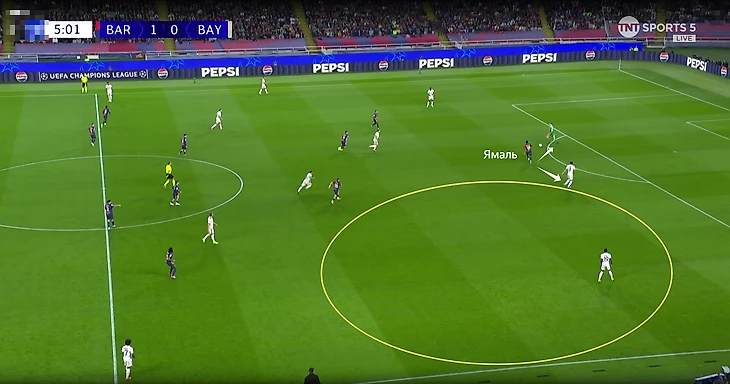 «Барселона» использовала привычную модель прессинга в этом сезоне (подробнее описывал здесь): давление начинают вингеры, расположенные в более высоких позициях. Например, здесь Ямаль идёт до конца в прессинг от центрального защитника до вратаря. Естественно, что в это время остаётся много свободы на фланге, чем может пользоваться соперника (особенно уровня «Баварии»).