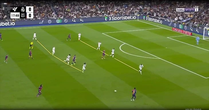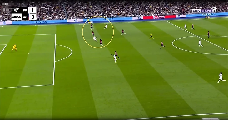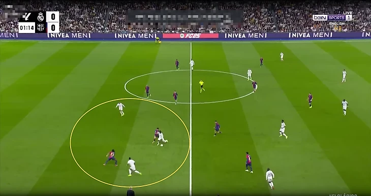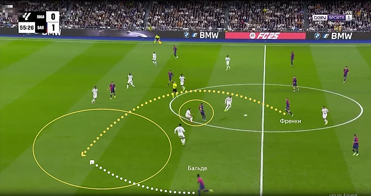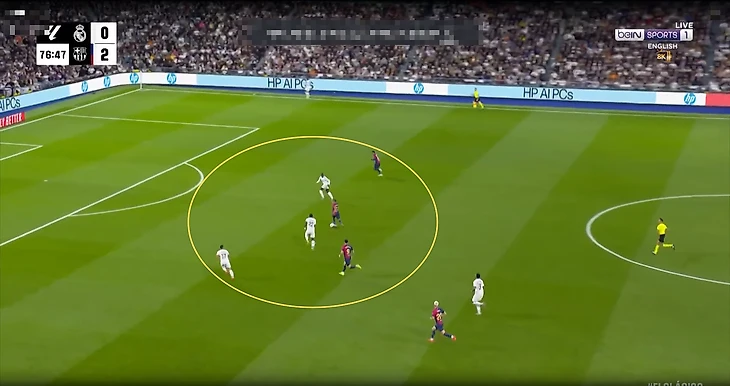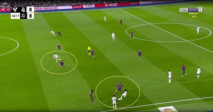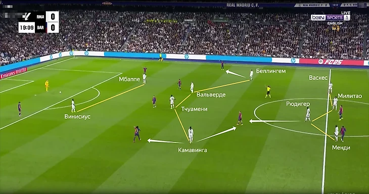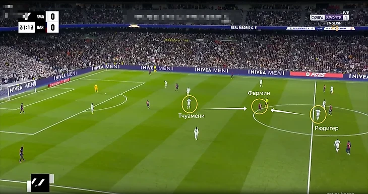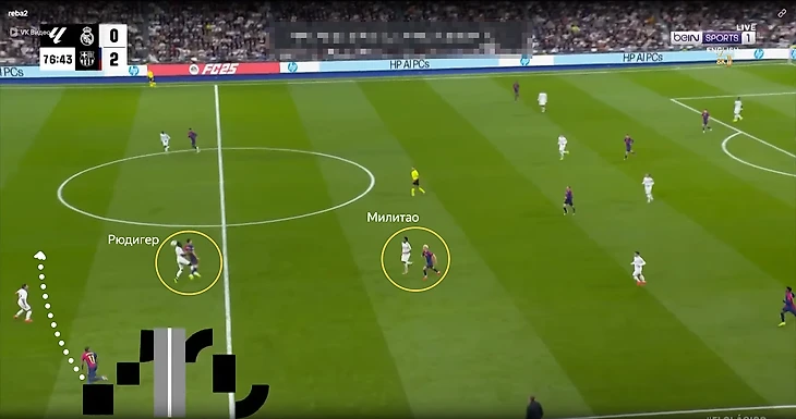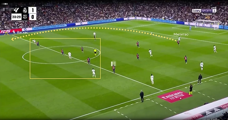 Тчуамени и Рюдигер это замечают и указывают на свободного игрока «Барселоны». В конечном счете на него выдвигается Милитао. Сзади остается соотношение 3 в 3 (численное равенство обычно в пользу атаки).