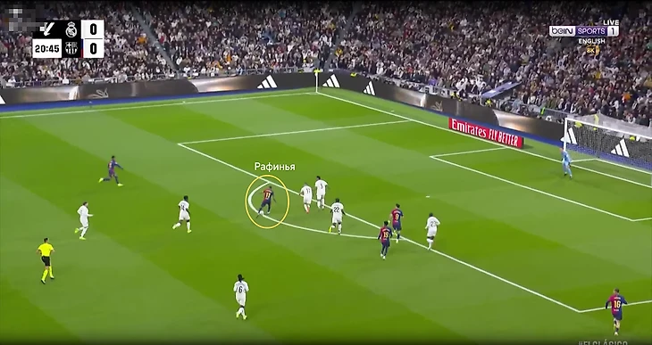 Здесь снова агрессивная (в плане выдвижений, не в смысле грубости) манера игры защитников «Мадрида» приводит к большому свободному пространству за их спинами. Так Рафинья получил больше пространства и возможностей в завершающей стадии.