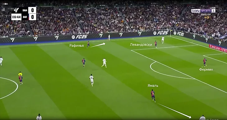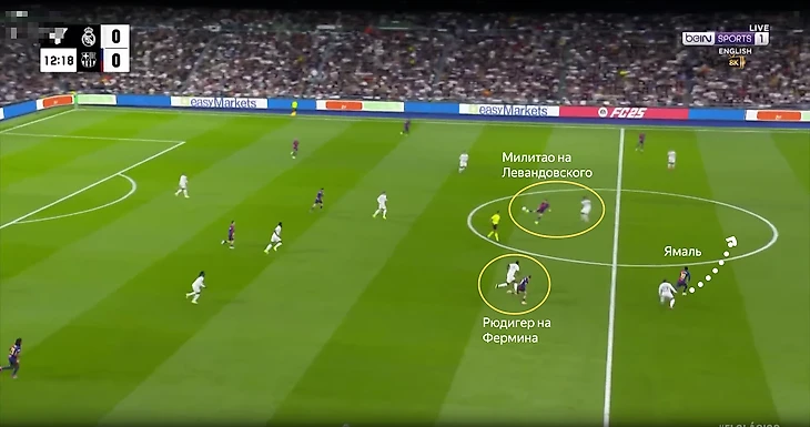 Вот несколько характерных моментов. Здесь Милитао и Рюдигер (оба центральных защитника) выдвигаются за Левандовским и Фермином. В результате за их спинами образуется свободное пространство, куда вбежит Ламин Ямаль. Эпизод закончится опасным моментом «Барсы».