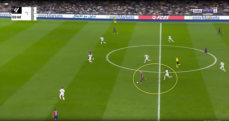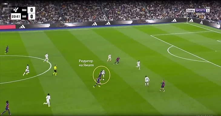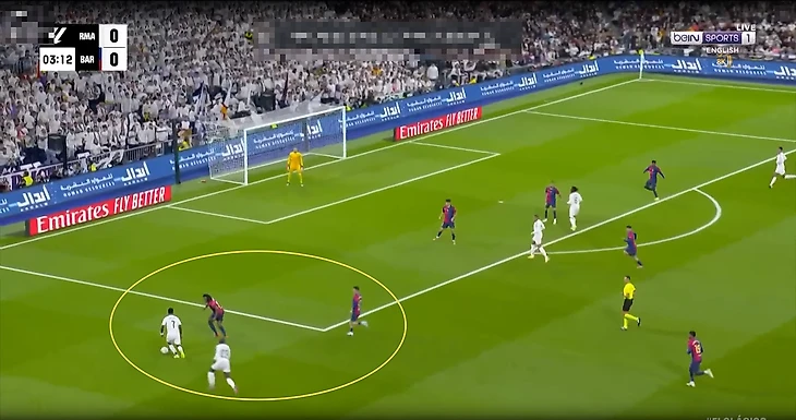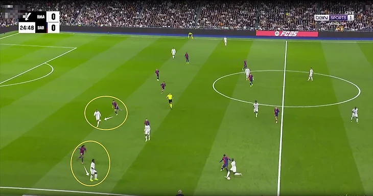 Высокая линия обороны присутствовала в любых режимах. Это приводила к ситуациям, когда «Реал» целенаправленно пробовал пользоваться потенциальной уязвимостью каталонцев. Здесь Кунде ушел на фланг за Винисиусом, Кубарси выдвинулся на Камавинга. В результате свободная зона образовалась для Мбаппе.