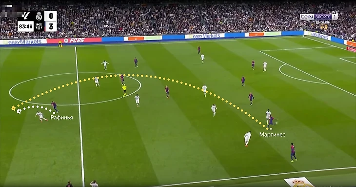 Тут в очередной раз «Барселона» воспользовалась свободным пространством за спинами защитников «Мадрида». Добавим к этому фактор исполнителей: Иньиго Мартинес отлично делает подобные длинные передачи с рабочей левой, Рафинья здорово открывается на свободном пространстве.