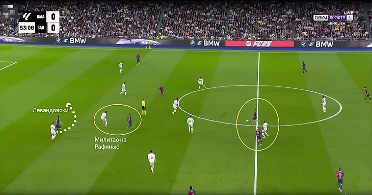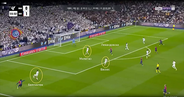 Здесь на Рафинью активно выдвинулся уже Лукас Васкес. По цепочке осталась свободной зона на фланге. Туда пришлось смещаться Беллингему. Милитао также был вынужден уйти ближе к флангу, из-за чего осталась большая зона между двумя ЦЗ «Мадрида» – Левандовски завершил именно из этой зоны.