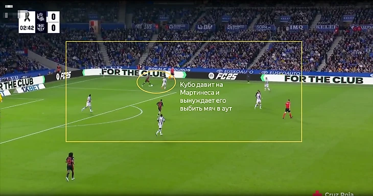 Например, здесь представлен именно такой эпизод: баски перекрывают центральное направление и вынуждают игроков «Барселоны» перемещать мяч на фланг, где на Иньиго Мартинеса оказывается давление. В результате защитник «Барсы» под прессингом делает неточную передачу в аут. Итог – потеря мяча и переход владения к «Реал Сосьедаду».