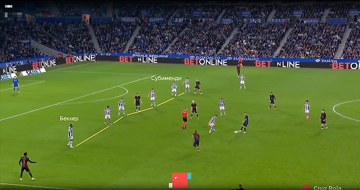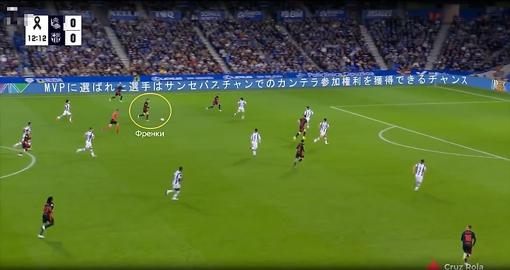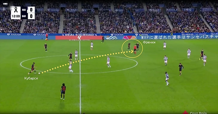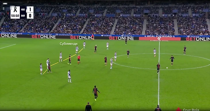 В матче было несколько ситуаций, когда гостям удавалось преодолевать чужой давление и выходить на свободное пространство, что иногда приводило к моментам у чужих ворот. Например, здесь каталонцы поймали соперника на перестроении (Кубо и Мендес поменялись местами): образовался коридор для передачи и свободный Де Йонг в качестве адресата.