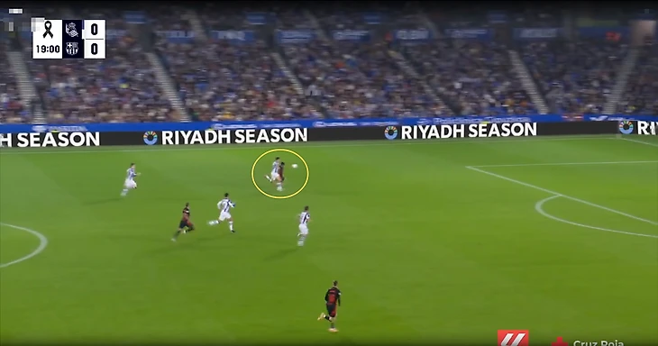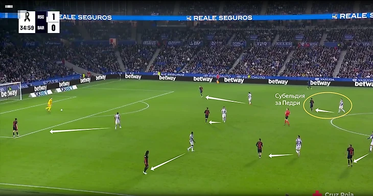 Например, здесь удалось длинной передачей за спину защитникам «Реал Сосьедада» вывести на ход Педри. Если бы на его месте был кто-то более скоростной (например, Рафинья), то эпизод мог бы закончиться опасным моментом у ворот хозяев.