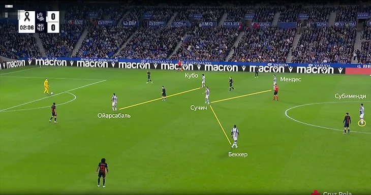 Против «Барсы» Альгуасиль ожидаемо настроил команду на качественные действия без мяча. «Реал Сосьедад» не отходит в глубокую оборону на свою половину поля, а стремится встречать соперника высоко (третьи в Ла Лиге по интенсивности прессинга, PPDA = 8.35), поэтому акцент в первую очередь стоит делать на прессинг-структуре баскской команды.
