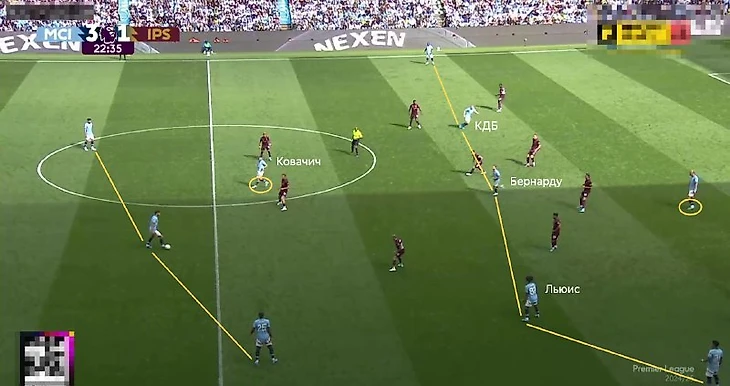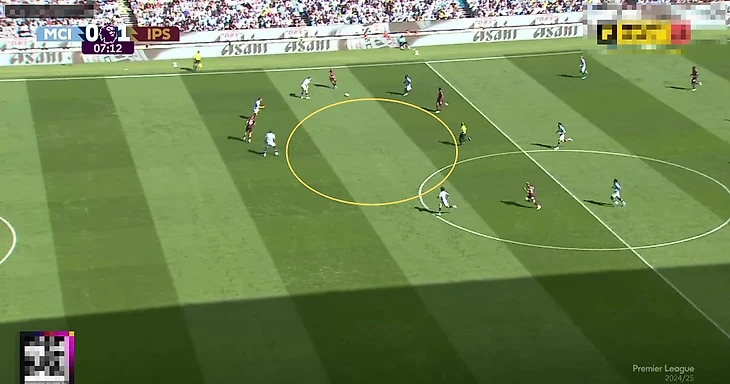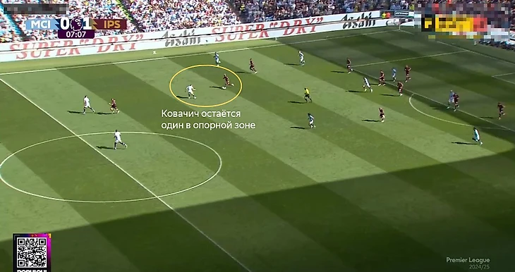 Вот характерный эпизод. «Манчестер Сити» расставляется в структуру 3-1-5-1. В опорной зоне остаётся один Ковачич. В результате «Ипсвич» проводит контратаку и пользуется дырой в опорной зоне команды Гвардиолы. Конечно, здесь сказалось и отсутствие Родри, но в первую очередь влияние оказала именно системная уязвимость.