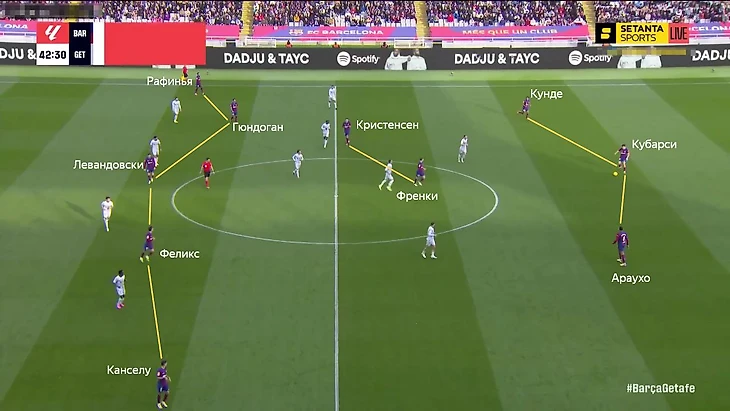 При этом структура может создаваться разными способами, как на примерах выше. «Манчестер Юнайтед» совершил трансформацию за счёт смещения Далота с правого фланга защиты в опорную зону. У «Барселоны» позицию поменял левый защитник: Канселу поднялся по флангу.
