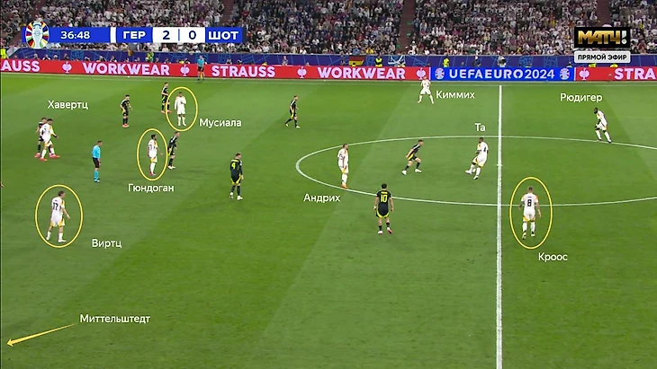 Другая идея – изменение соотношения в последней линии: вместо двух игроков в опорной зоне остаётся один футболист, а дополнительная опция появляется впереди. Фактически команда начинает действовать в структуре 3-1-5-1 с тремя десятками между линиями. Например, такую картину можно было наблюдать в сборной Германии Юлиана Нагельсманна на Евро-2024.