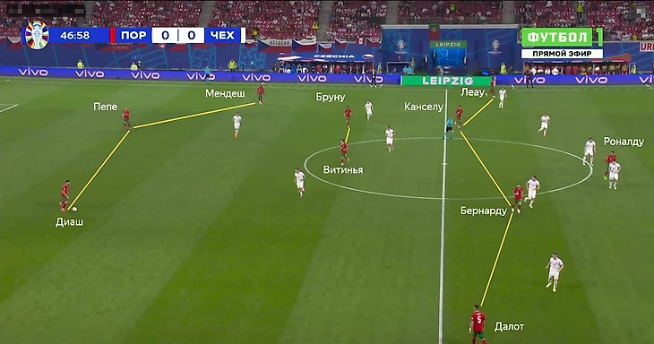 В первую очередь важны именно принципы, которые реализуются в такой структуре. Во-первых, грамотное заполнение поля в атакующем плане: все пять вертикальных каналов заняты, что даёт варианты впереди и возможность использовать всё поле. Также с такой расстановкой можно создавать перегрузы в последней линии.