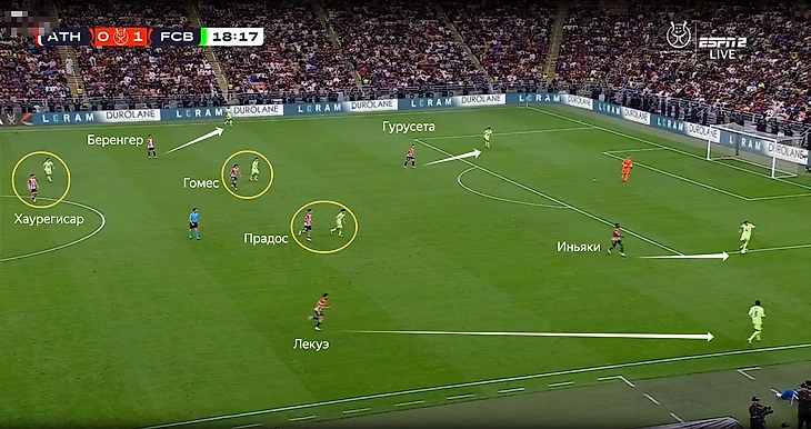 На этой картинке хорошо видно, что Алекс получает больше свободы. Здесь характерны позиции вингеров «Атлетика». Слева Беренгер действует по крайнему защитнику Кунде. А слева Иньяки Уильямс в первую очередь ориентирован на центрального защитника Мартинеса. На Бальде выдергивается правый защитник Лекуэ.