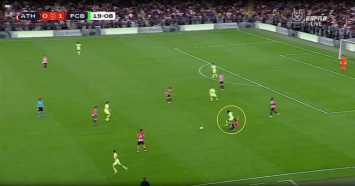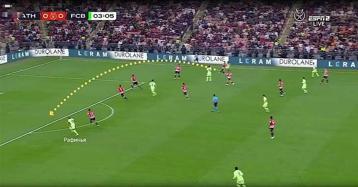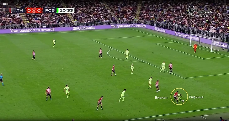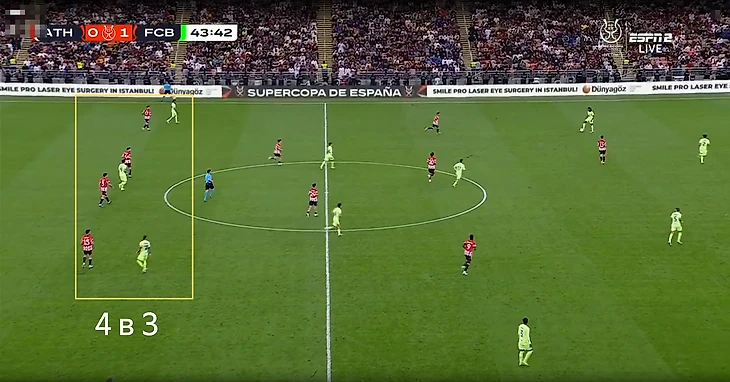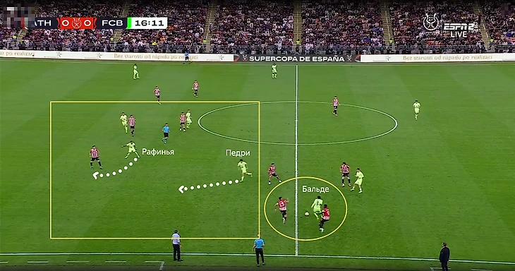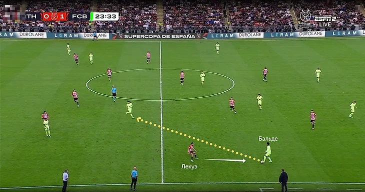 Такая ситуация могла проявляться и на более поздних стадиях развития атаки. Здесь «Атлетик» стремится создавать плотность в зоне мяча слева и достаточно спокойно оставляет Бальде свободным на правом краю.