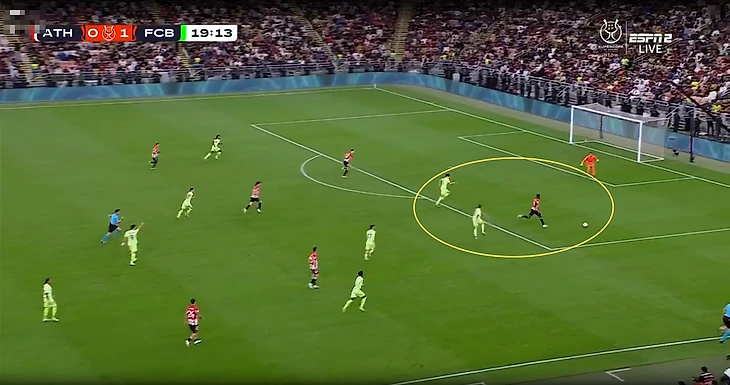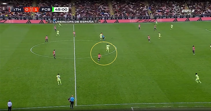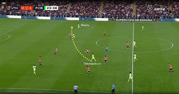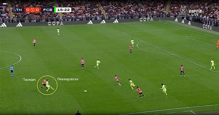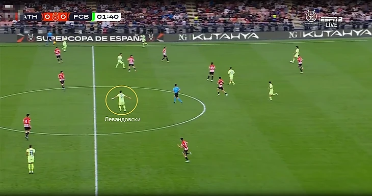 Здесь Левандовски все-таки смог получить мяч в центре поля, но игрок долго его обрабатывал, из-за чего его успел накрыть Лекуэ. В результате эпизод закончился опасным моментом «Атлетика» в концовке первого тайма.