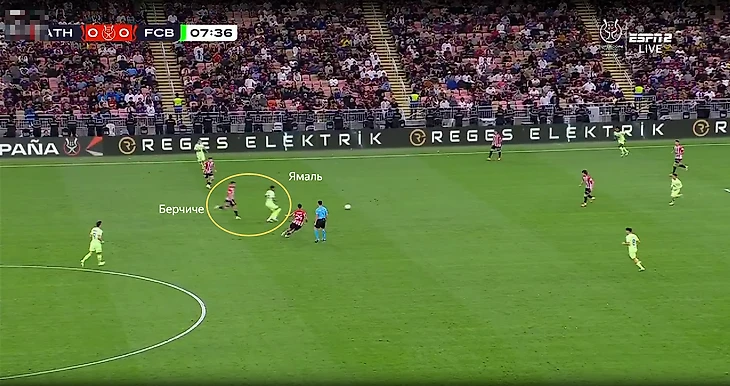 Здесь Педри переводит мяч направо на Ямаля, которого поддерживает Кунде. Игроки «Барсы» получают свободу, а Берчиче вынужден разрываться между двумя соперниками.