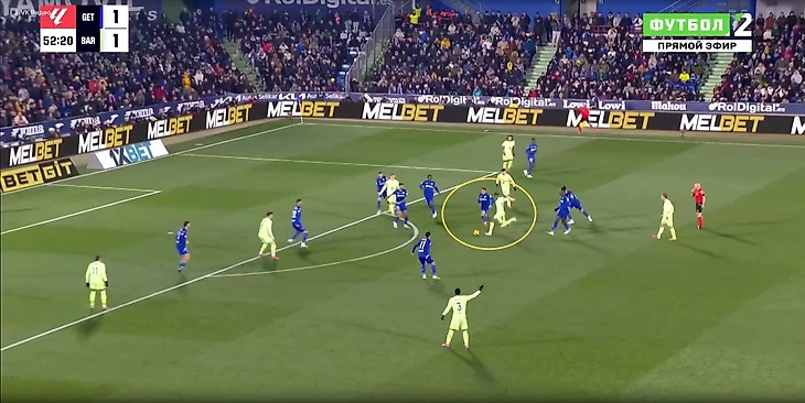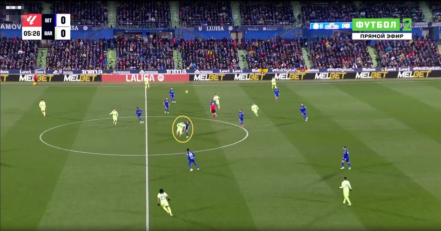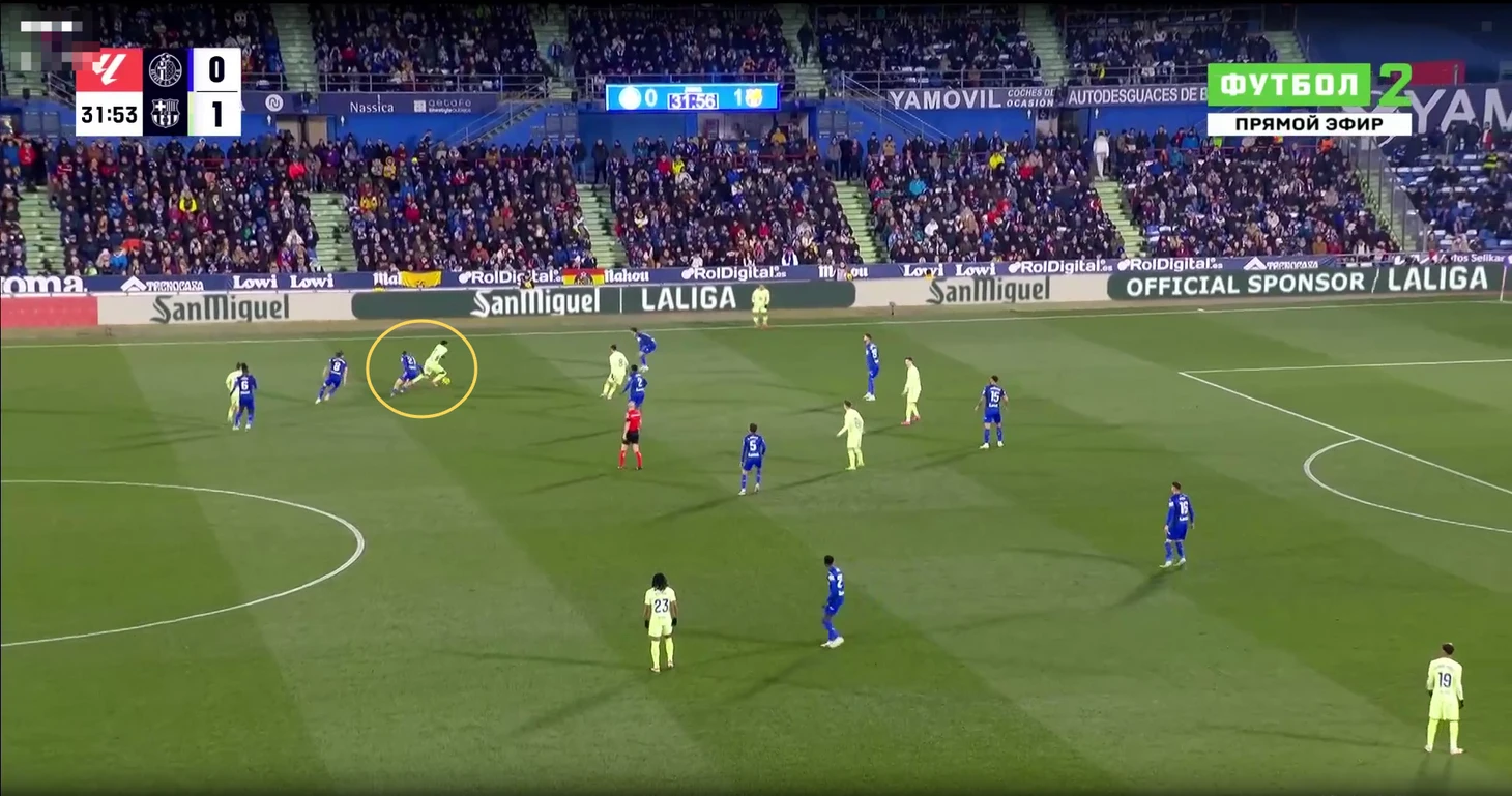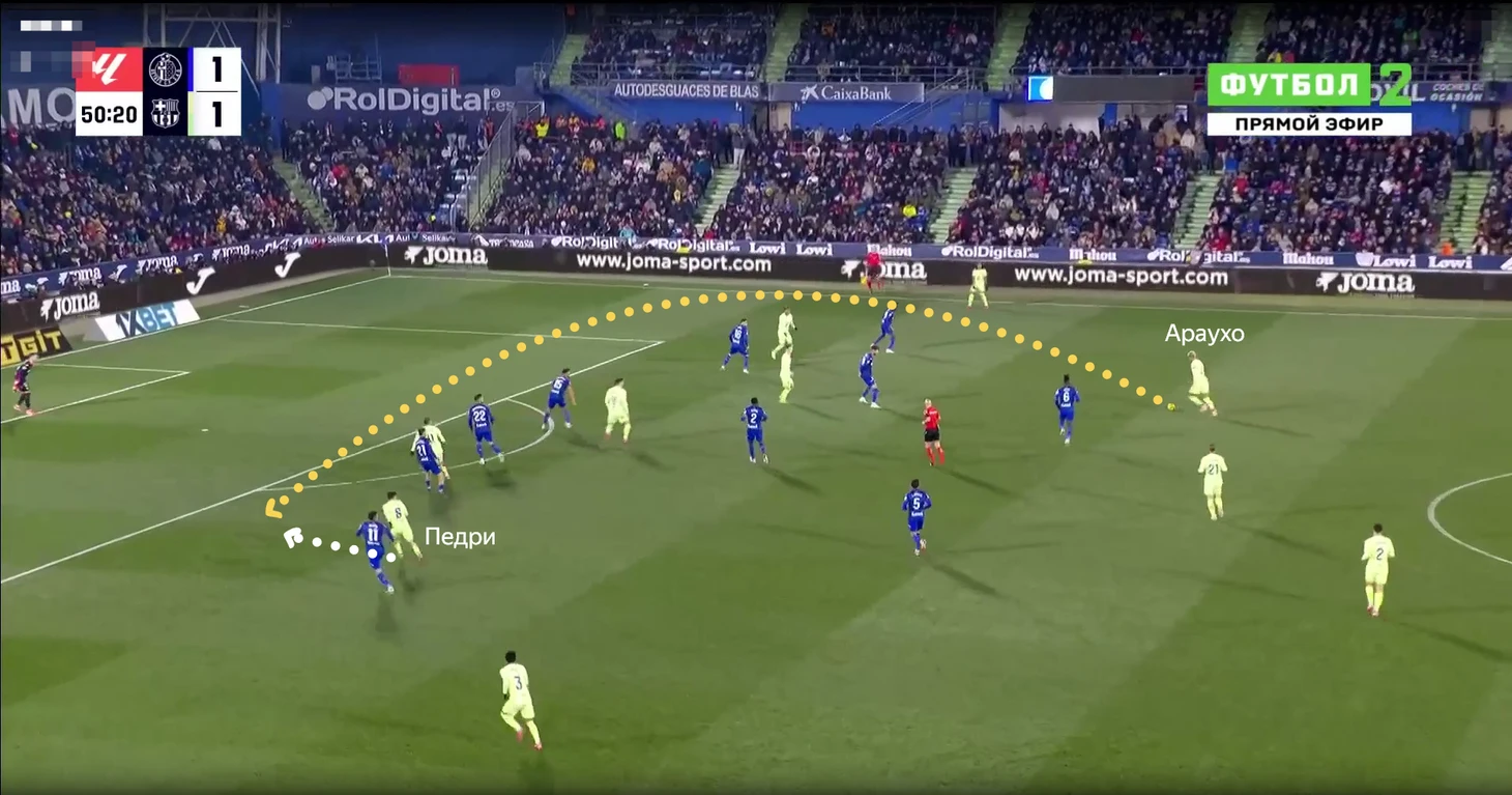 В данном эпизоде все игроки «Хетафе» за линией мяча у своей штрафной, но даже так Араухо свободно выполняет подачу на рывок Педри, которого упустили.