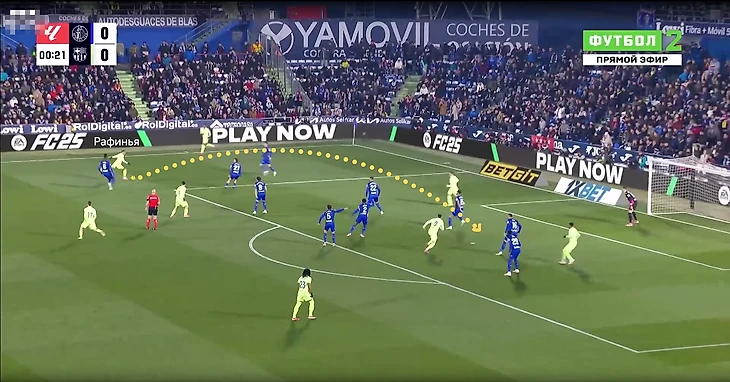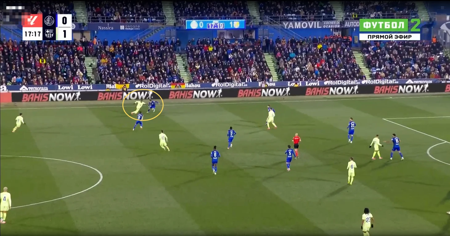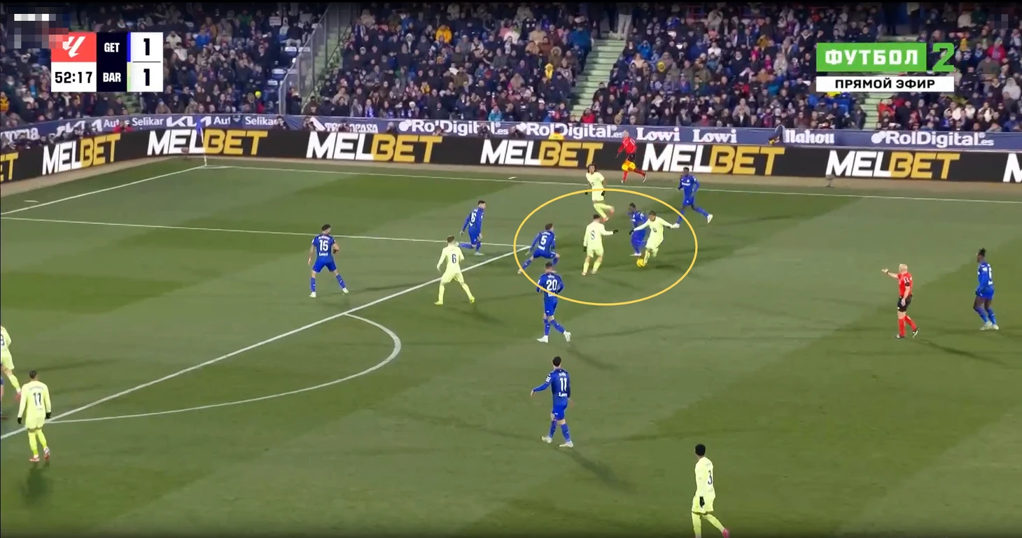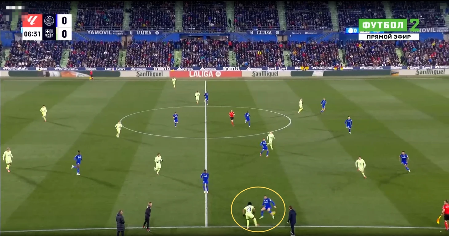 В данном эпизоде все игроки «Хетафе» за линией мяча у своей штрафной, но даже так Араухо свободно выполняет подачу на рывок Педри, которого упустили.