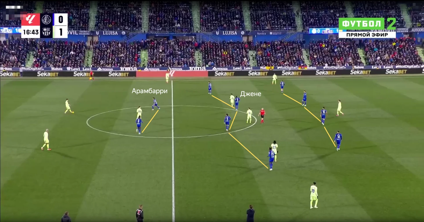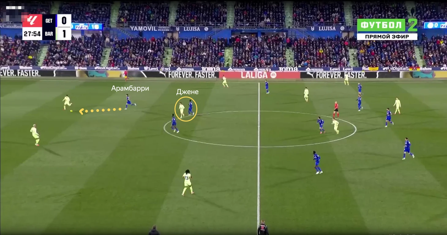 Ситуативно Джене мог идти еще выше. Например, здесь выдвинулся на Касадо, так как Арамбарри пошел прессинговать Кубарси.