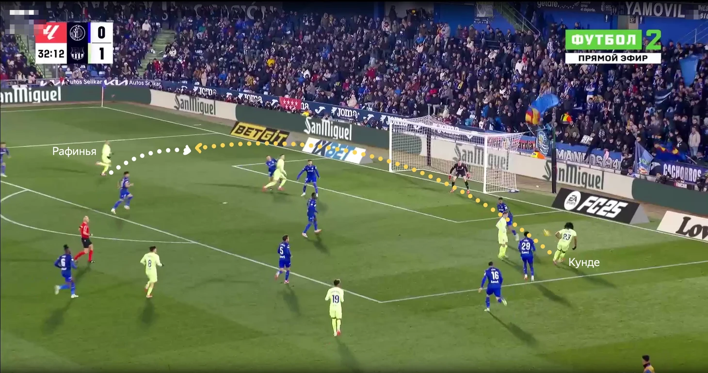 В эпизоде с голом проявилось сразу несколько факторов. Во-первых, момент начался с дриблинга Бальде на фланге. Во-вторых, крутейший разрезающий пас Педри. В-третьих, подключение Кунде в штрафную.