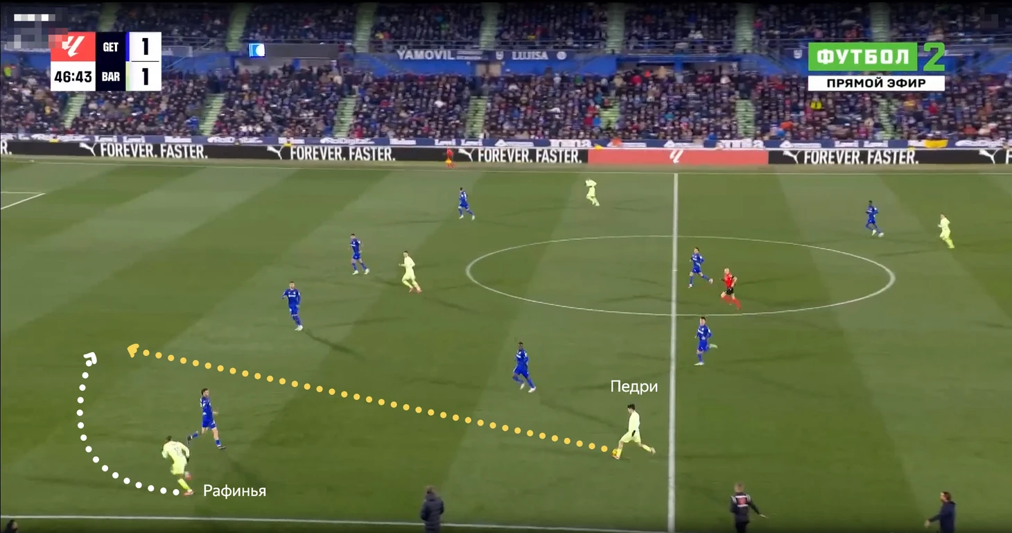 Динамика на левом фланге сводилась к нескольким алгоритмам. Из-за плотной защиты «Хетафе» иногда было тяжело пробраться к воротам через центр. В таких ситуациях «Барса» прибегала к навесам на дальнюю штангу в исполнении Рафиньи.