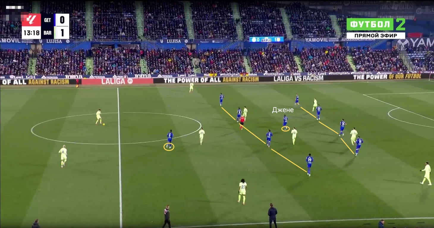 Жюль уже на привычной основе часто идет вперед и действует в высокой позиции (вот пример из прошлого матча). Против низкого блока «Хетафе» подключения дополнительного игрока вперед были еще более актуальными.
