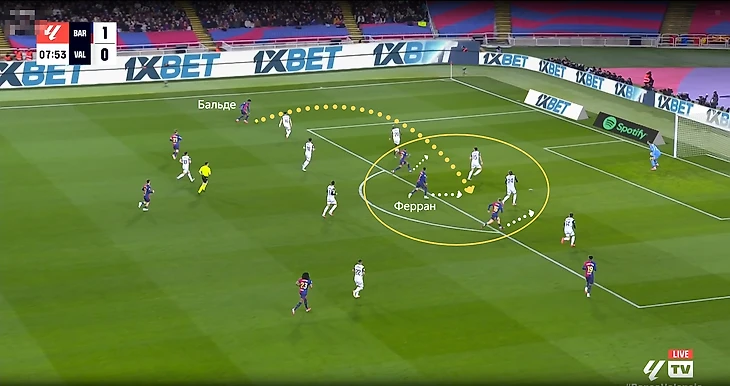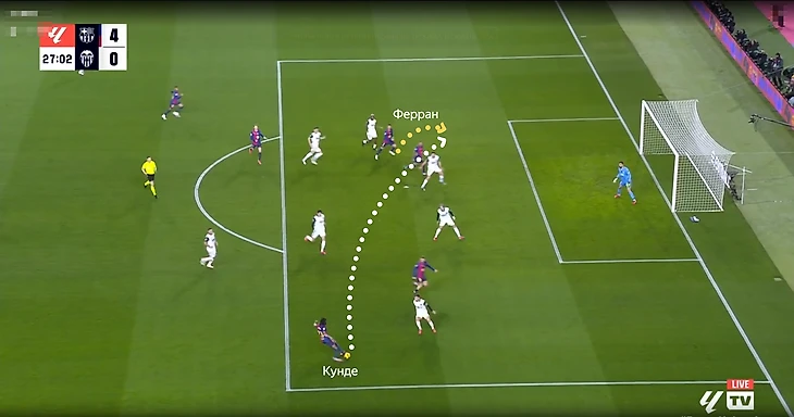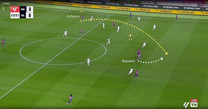В результате игрок «Барсы» выполняет длинную передачу на рывок Фермина в свободное пространство.