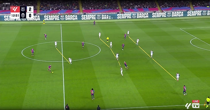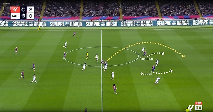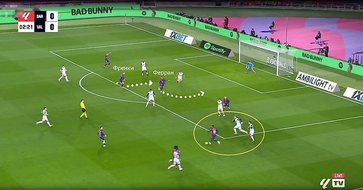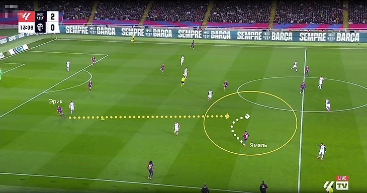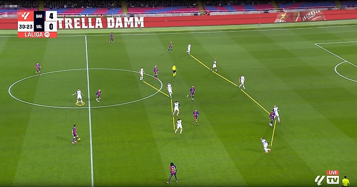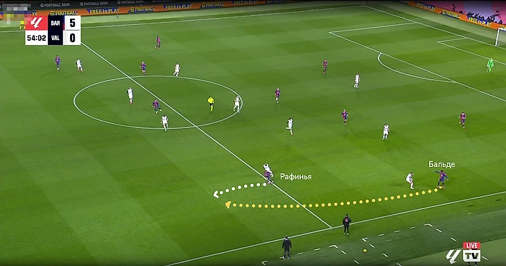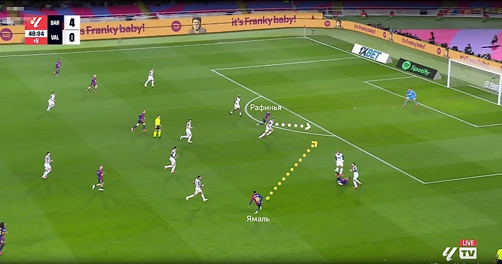 Здесь снова у «Валенсии» огромный свободный коридор между двумя центральными защитниками, чем пользуются Ямаль и Рафинья.