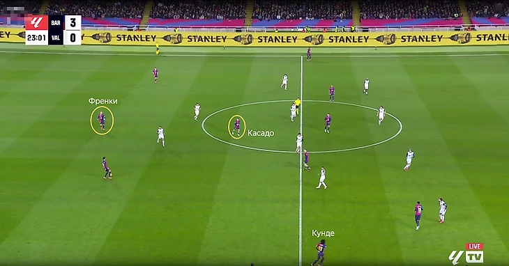 Если смотреть на динамику, то она была больше похожа на то, что было на старте сезона: тогда Берналь (а сейчас Френки) часто опускался на позицию между центральными защитниками, Касадо располагался выше, а Кунде мог подключаться в атаку, так как тройка в начальной стадии формировалась альтернативным образом. Однозначно можно сказать, что это – то направление, за которым точно стоит следить в игре «Барселоны».