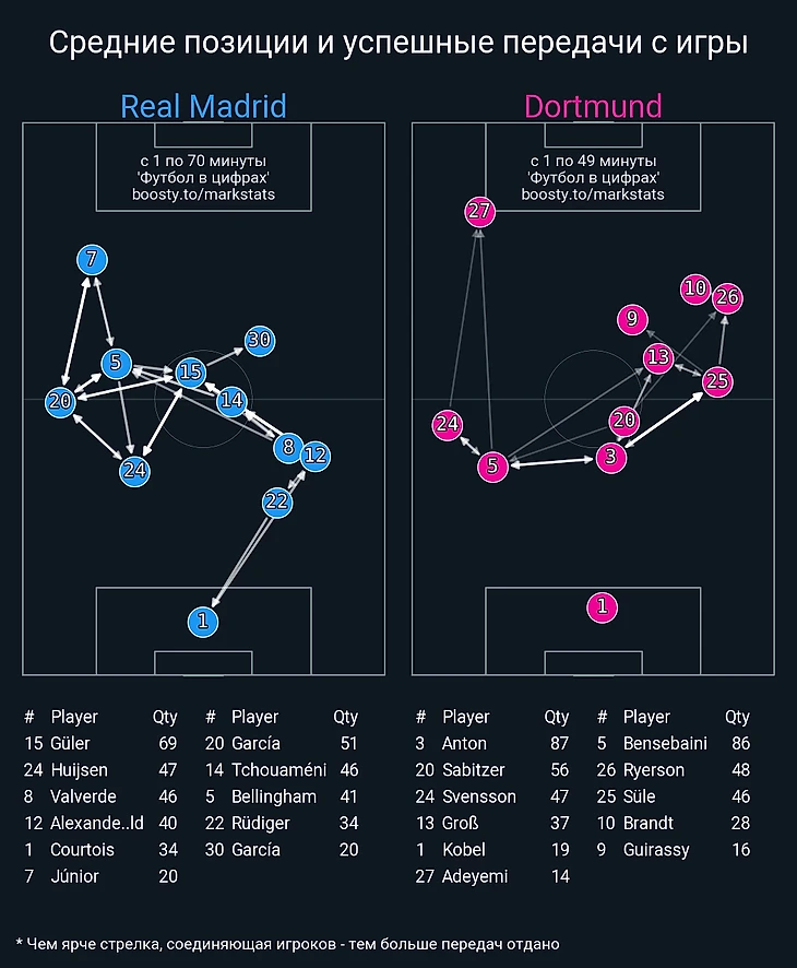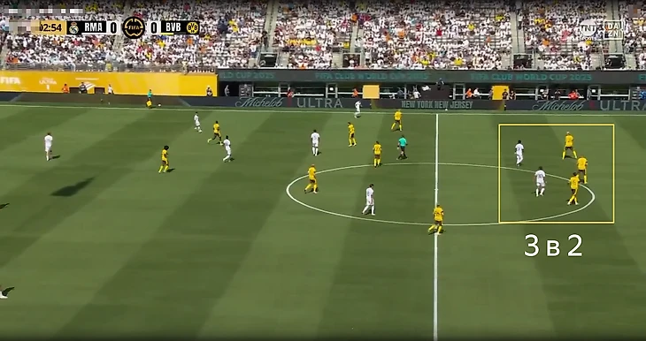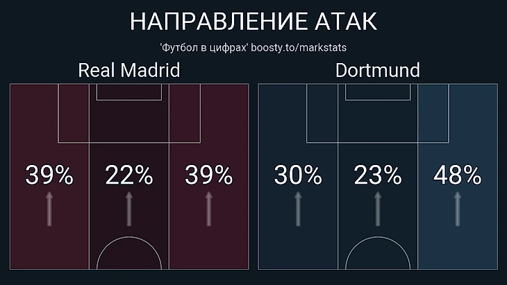 Например, «Ювентус» в прошлом матче периодически доходил до ворот Куртуа именно через зону Гюлера. «Боруссия» также заметно больше (48%) атаковала через часть поля, где были Винисиус и Гюлер.