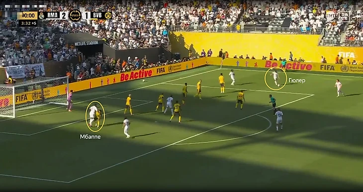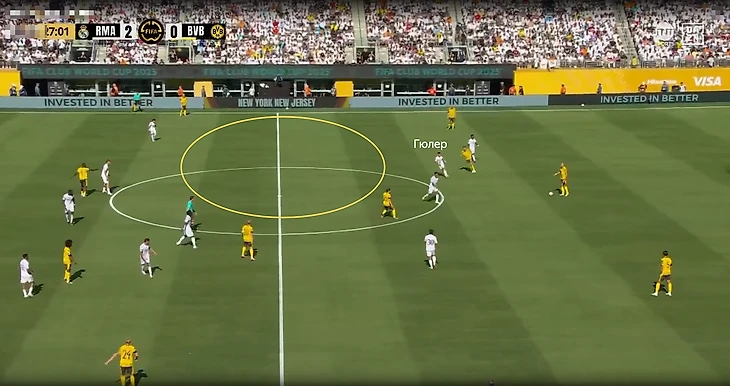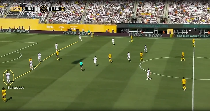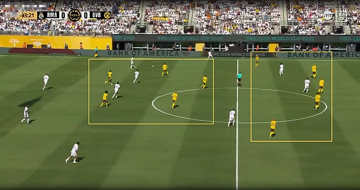 На попытки «Боруссии» перегрузить последнюю линию «Реал» отвечал спусками Феде Вальверде в защиту. Также опускаться мог Тчуамени. Например, в эпизоде ниже они вдвоем сели в линию обороны в момент, когда Трент поднялся выше и оставил свою зону.