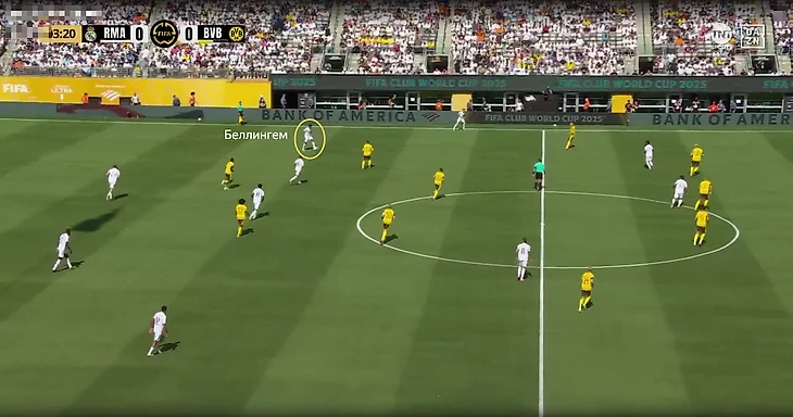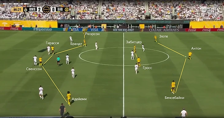 В целом в центре поля у «Мадрида» была постоянная динамика: все могли оказаться на всех позициях. Зачастую это помогало находить свободные зоны в схеме «Боруссии» и атаковать через эти пространства.