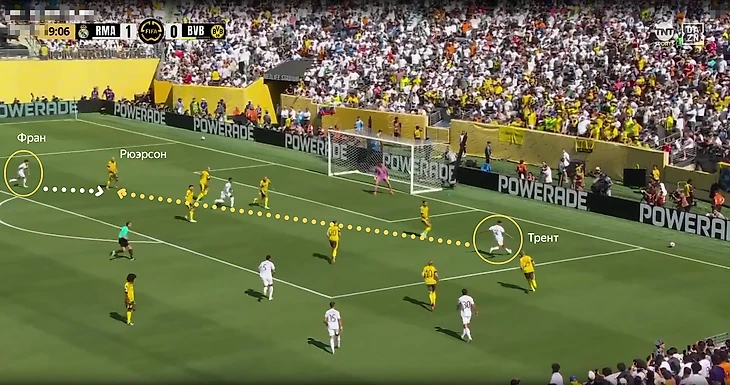 Против «Дортмунда» команда Алонсо показала два режима, в которых она может удерживать счет. «Реал» быстро повел в счете и в первом тайме фактически отдал мяч (41.5%), вынудив соперника придумывать что-то с мячом. Например, вот сколько свободы получали игроки «Боруссии» в начале своих атак.