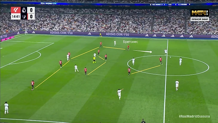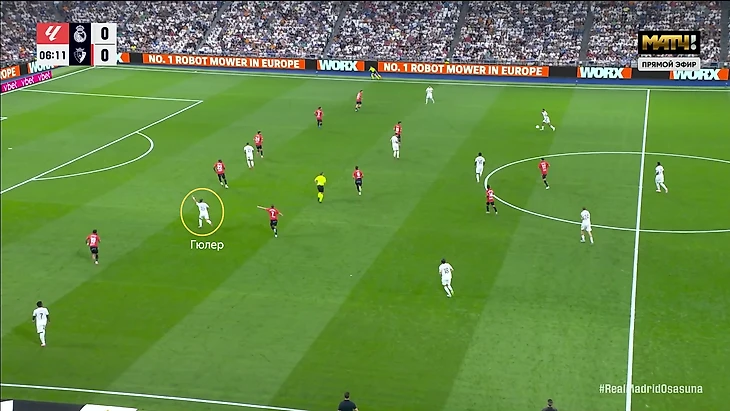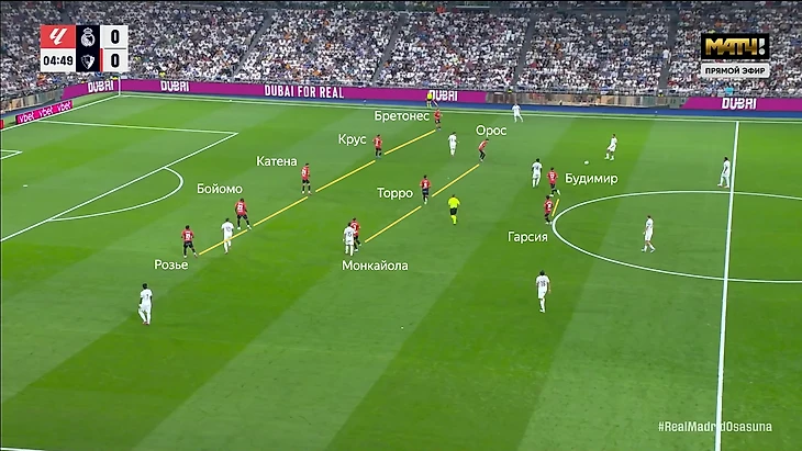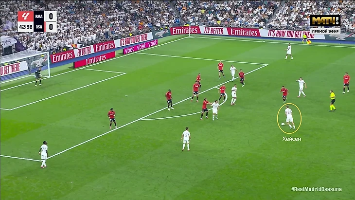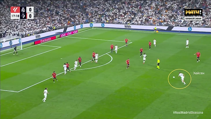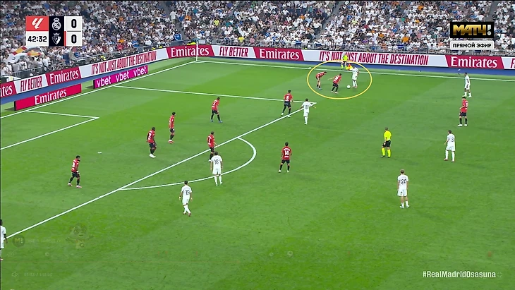 Против «Осасуны» у команды был четкий шаблон формирования атак. «Мадрид» выстраивался в схему 2-3-4-1. В большинстве случаев структура создавалась за счет смещения крайних защитников Каррераса и Трента в центральную зону.