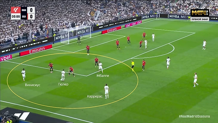 Большую часть своих атак «Мадрид» проводил через левую сторону поля (51%). Зачастую в этой зоне оказывались Винисиус, Каррерас, Гюлер и Мбаппе.