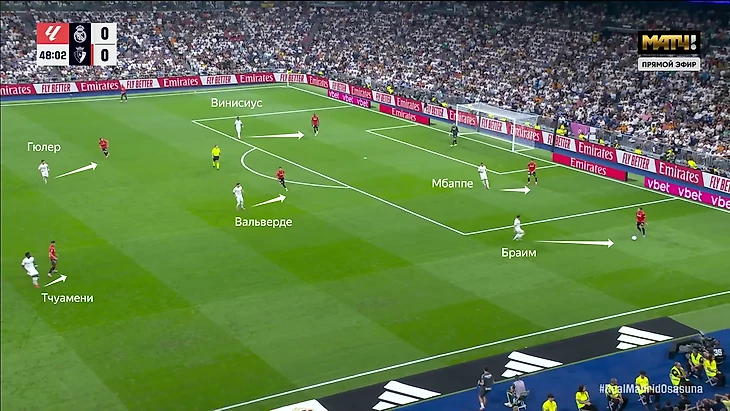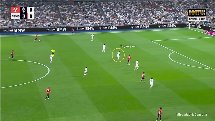 Команда Алонсо мало времени проводила без мяча (70.1% владения), но в редкие моменты обороны можно было наблюдать уже привычные опускания Тчуамени на позицию между центральными защитниками и переход на пятерку.