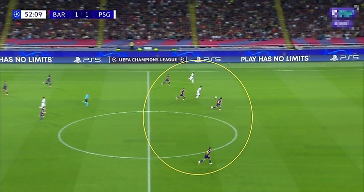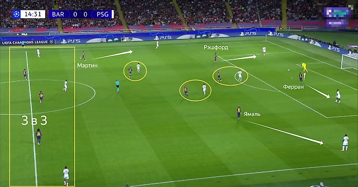 В данном эпизоде уже сам открывался под пас от Ямаля. Защитники парижан действовали в активной манере и часто выдвигались за своими оппонентами. Поэтому у футболистов «Барсы» периодически появлялась возможность находить свободное пространство.