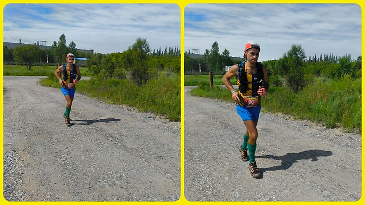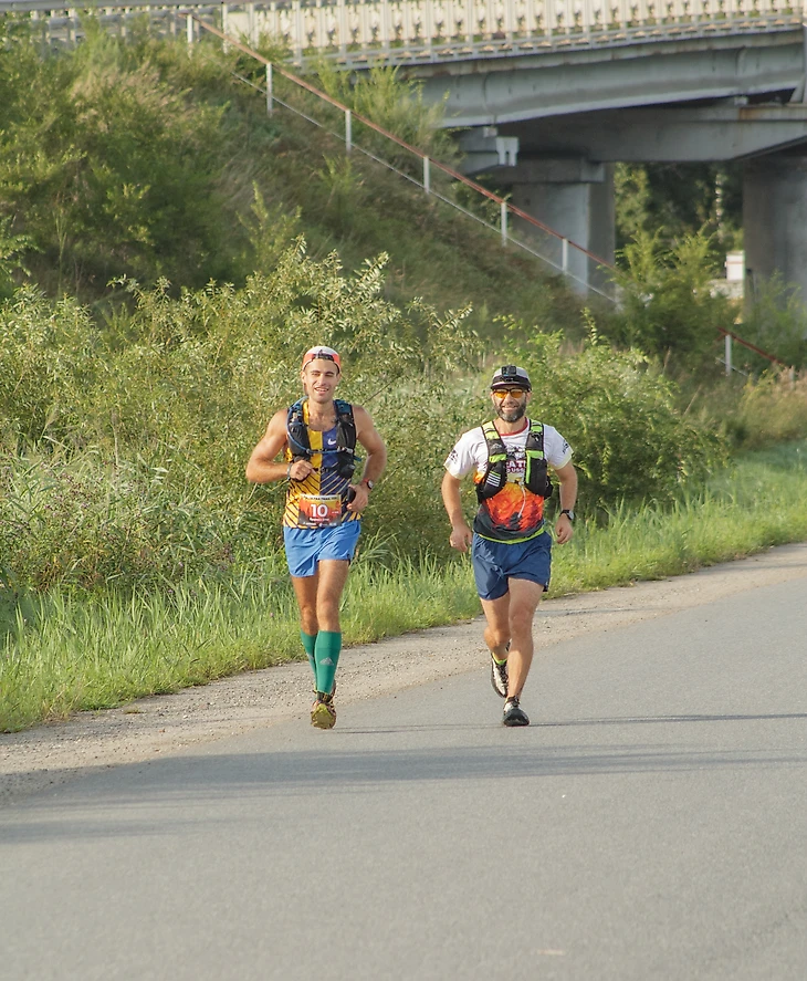 Освежился, бежим по грунтово-земляной дороге сквозь поля, местами лужи на всю ширину, приходится лавировать и склоняться. Эти прекрасные моменты начала гонки прошли за разговорами с напарником.