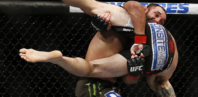 До того, как Мэтта опрокидывали в партер, он, безусловно, представлял угрозу: тайский клинч, колени, локти – всё это использовалось, ровно, как и удары ногами по верхнему уровню. Но противник держал отменно. Стоит обратить внимание, как в первой пятиминутке Хендрикс принял головой хай-кик, но продолжил сражаться, как ни в чём не бывало. Если посмотреть правде в глаза, то единственный шанс Брауна состоял в том, чтобы хорошо и много попадать по Джони, удерживаясь, между делом, на ногах. Ну, или, на худой конец, придумать что-то на канвасе, коль сдерживать тэйкдауны банально не хватало сил. Но и второй вариант реализован не был – «Бигг Ригг» контролировал ситуацию и в партере, где вновь нельзя не отметить силу Джони.