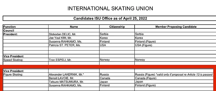 Их трое – канадец Бенуа Лавуе, японец Татсуро Матсумура и финка Сусанна Рахкамо (помните, она выступала в танцах на льду в эпоху дуэта Грищук/Платов и даже взяла золото Евро-1995?). Безусловного фаворита среди них нет, хотя о Матсумуре говорят как о наиболее вероятном преемнике Лакерника, если действующий вице-президент вылетит из гонки.