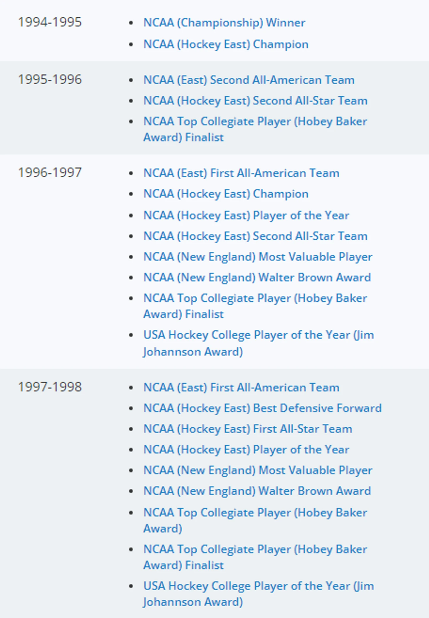 Обладатель Кубка Стэнли в составе «Колорадо Эвеланш» в сезоне 2000-2001.