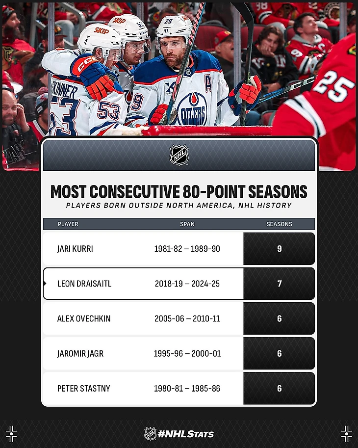Чтобы вы понимали, почему это так круто, замечу следующее: есть только один игрок в истории НХЛ, рожденный за пределами Северной Америки, который в своей карьере имеет больше таких сезонов. И это Яри Курри, финский нападающий. Он в девяти сезонах подряд добирался до отметки в 80 и более очков за сезон.
