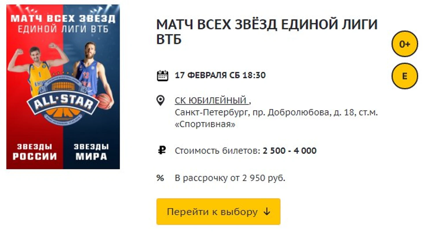 Обратите внимание, что билетов осталось совсем немного, цена на них начинается от 2500 рублей. Конечно, можно взять билеты у перекупщиков в день самого Матча Всех Звезд, но стоит ли переплачивать?